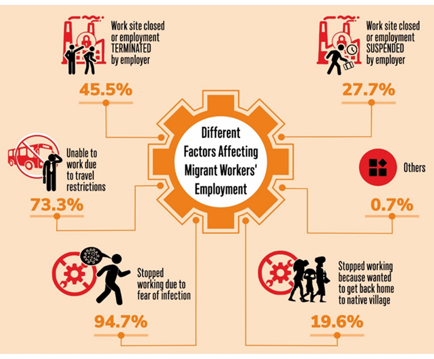 There were multiple, overlapping factors that contributed to the disruption of the employment of migrant workers. About 70% of them reported being impacted by worksite closure, or employment being terminated or suspended by the employer. Nearly three-quarters also reported being unable to work due to travel restrictions. Nearly all (more than 94%) surveyed migrant workers report fear of infection as a factor contributing to them stopping work (Figure 1).