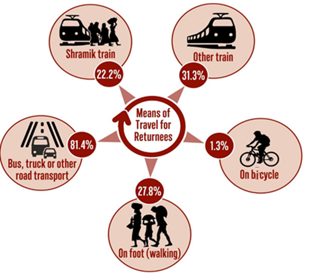 More than half of migrant workers returned to the native village with the disruption of work in destination areas. A typical worker spent Rs. 3,000 on the return journey. Our survey finds that while migrant workers started trickling back to their native villages in February 2020 itself, return migration accelerated during March through May. Migrant workers who returned used more than one mode of travel to get back to their native village. Only a little more than one-fifth of the returnees made use of Shramik (workers) trains7 for their return journeys (Figure 4). Indicative of their desperate situation under lockdown conditions, more than a quarter of them made at least a part of the journey on foot, often covering very long distances.