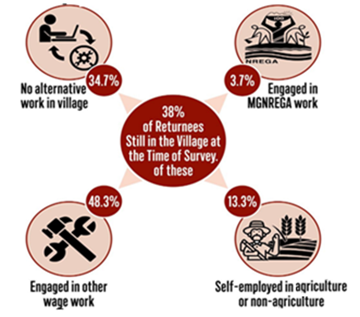 Among those returning to their village, the typical worker lost more than 40 days of work in the period before they returned to the village. Less than two-thirds of the returnees found alternative part-time work around the village, and for those who found work, this work was on average only about 3-4 days per week. A mere 4% of the returnees found work on projects under the Mahatma Gandhi National Rural Employment Guarantee Act (MNREGA)8 (Figure 5).