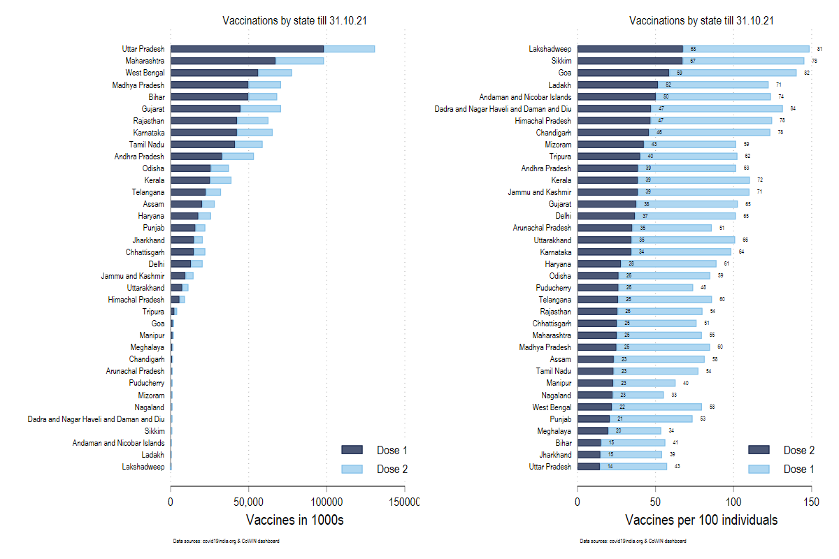 Figure 6. Covid-19 vaccinations in India (till October 2021), by state, in absolute (left panel) and proportional (right panel) terms