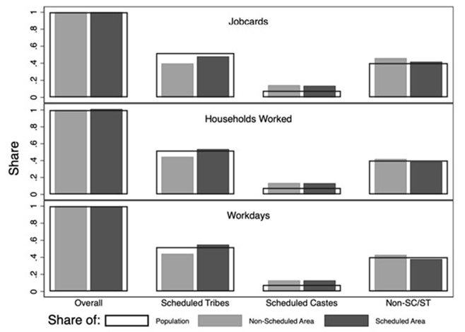 हम पाते हैं कि मनरेगा वितरण लक्षित अल्पसंख्यकों (एसटी) की स्थिति में काफी हद तक सुधार करता है, जो अनुसूचित क्षेत्रों में 24% अधिक मनरेगा कार्य दिवस प्राप्त करते हैं। यह सुधार मुख्य रूप से गैर-एससी/एसटी हेतु कार्य की कीमत पर आता है, जो 11.5% कम कार्यदिवस प्राप्त करते हैं। हमें कोई सबूत नहीं मिला कि यह कोटा गैर-लक्षित, ऐतिहासिक रूप से वंचित अल्पसंख्यकों (एससी) के लिए रोजगार में किसी बदलाव का कारण बनता है। कुल मिलाकर, परिणाम यह संकेत देते हैं कि अनुसूचित क्षेत्रों में सरकारी कार्यक्रमों की डिलीवरी गैर-अनुसूचित क्षेत्रों की तुलना में बदतर नहीं है। आकृति 2 में मनरेगा के काम का हिस्सा अनुसूचित बनाम अन्य क्षेत्रों में समूह की आबादी के अनुपातों के अनुरूप दिखाया गया है। कुल मिला करहमारे निष्कर्ष प्रतिज्ञानात्मक कार्रवाई नीतियों की आलोचनाओं को नकारते हैं - लक्षित हाशिए वाले समूहों को कोटा से लाभ मिलता है, गैर-लक्षित हाशिए वाले समूहों पर कोई भी बुरा प्रभाव नहीं पड़ता है, और समग्र विकास के परिणामों को नुकसान भी नहीं होता है।