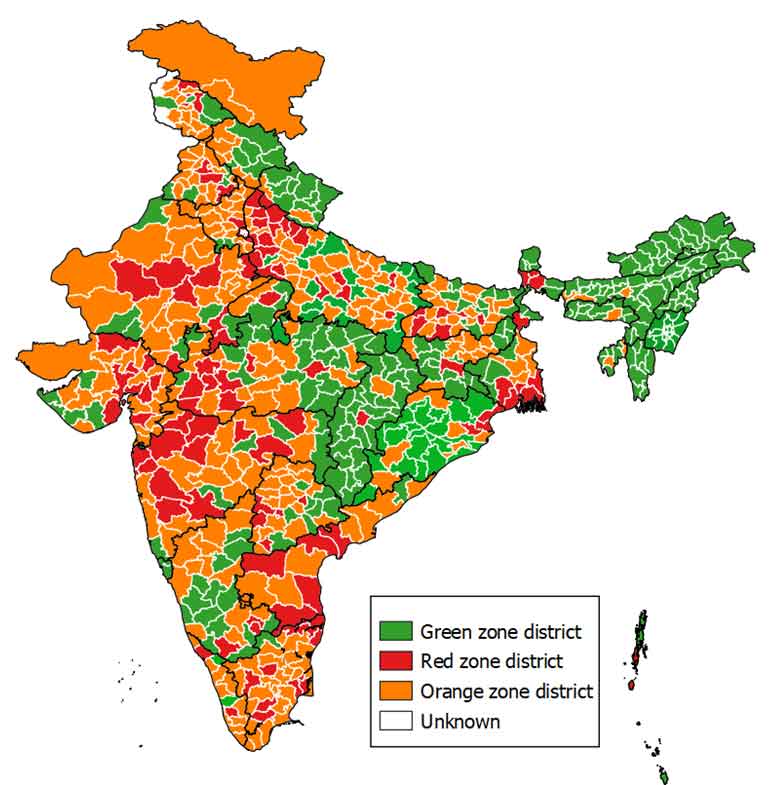- The Ministry of Health and Family Welfare defines red zones (with maximum restrictions) as, “areas that will have highest caseload districts contributing to more than 80 per cent of cases in India or highest caseload districts contributing to more than 80 per cent of cases for each state in India or districts with doubling rate less than four days”, and a green zone (with minimum restrictions) is an area, “where there are zero confirmed cases of coronavirus in the last 21 days”. Those that do not belong to either of these categories are classified as orange zones.