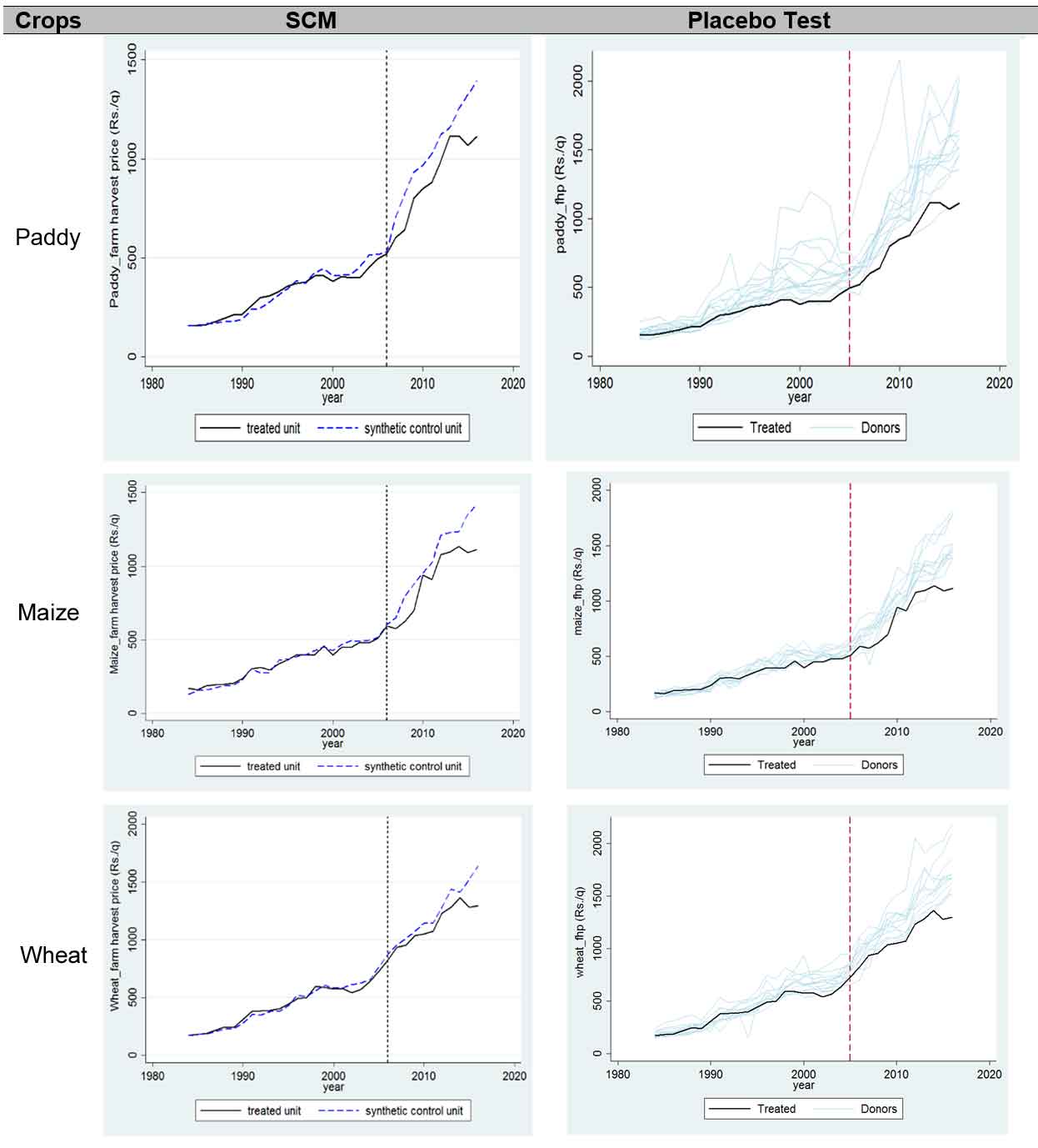 Figure 2 shows that barring wheat, prices of paddy and maize behaved in a similar fashion in Bihar as in other states. With such parallel trends, the difference in unit values post-2006 may be attributed to the reform, depending on other time-varying factors such as technology, policy, or extent of markets remaining constant.