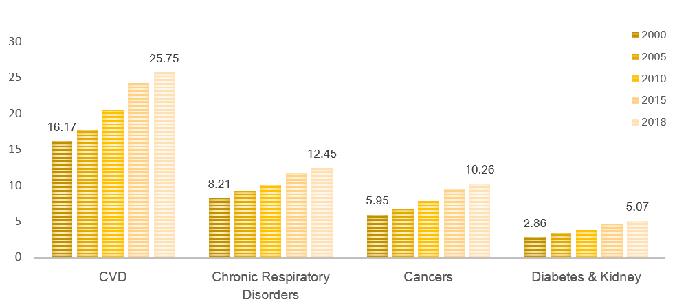 The establishment of the PMJAY has coincided with an important inflection point for women’s health in India. Healthcare access for women in India predominantly focused on the provision of maternal and childcare services, to address high maternal, neonatal and infant mortality rates. With the decline of these rates, and with the epidemiological transition from infectious to non-communicable diseases (NCDs), this picture is changing, globally as well as in India, and points to the changing healthcare needs of women (see Figure 1). As per data from the India State Level Burden of Disease (2017), non-communicable diseases, such as cardiovascular diseases (CVDs), chronic respiratory conditions, cancers, diabetes and kidney-related health issues accounted for 1 in 2 (53.5%) deaths among women in 2018, compared to 1 in 3 (33%) in 2000.