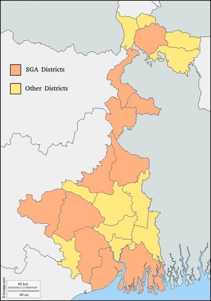 पश्चिम बंगाल सरकार ने वर्ष 2012 में अपने कुल 19 जिलों में से 11 (तत्कालीन) 'पिछड़े' जिलों में पूर्ण घरेलू विद्युतीकरण लाने के लिए एसजीए की शुरुआत की (आकृति-1)। पिछड़ा क्षेत्र अनुदान निधि के तहत एक बड़े परिव्यय द्वारा वित्तपोषित इस योजना का लक्ष्य इन जिलों में गरीबी रेखा से नीचे के बीस लाख से अधिक परिवार थे। क्रियान्वयन में वितरण अवसंरचना को मज़बूत करना शामिल था ताकि वंचित ग्रामीण इलाकों को बिजली का नियमित कनेक्शन मिल सके।