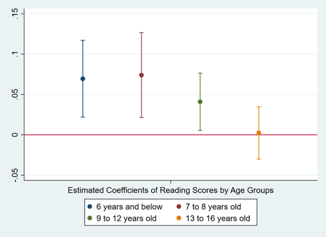 आकृति-2. विभिन्न आयु समूहों में, बच्चों के पढ़ने के अंकों पर घरेलू विद्युतीकरण का प्रभाव