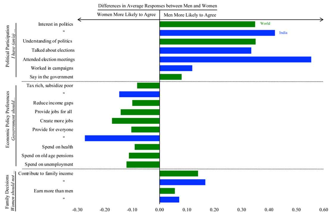 महिलाओं के राजनीतिक प्रतिनिधित्व की कमी के साथ साथ उनकी राजनीतिक सहभागिता की कम दरों का मतलब है कि पुरुषों की तुलना में महिलाओं की नीतिगत प्राथमिकताएं स्पष्ट रूप से अलग होती हैं, जिस पर विचार नहीं किया गया है। जैसा कि क्लेटन और ज़ेटरबर्ग (2018) दर्शाते हैं, महिलाओं की कल्याणकारी नीतियों के बारे में अलग-अलग प्राथमिकताएँ हैं, जैसे कि गरीबों को बुनियादी आवश्यकताओं की सब्सिडी दी जाना। यह भारत के लिए भी सच है। चित्र 1 भारत और दुनिया भर में महिलाओं और पुरुषों की राजनीतिक सहभागिता और नीतिगत प्राथमिकताओं में अंतर को दर्शाता है। भारत में, पुरुषों की तुलना में महिलाओं के यह मानने की संभावना लगभग 30 प्रतिशत अधिक है कि सरकार को गरीबों का कल्याण करना चाहिए, और यही संभावना कराधान, असमानताओं को दूर करने के लिए पुनर्वितरण उपायों और स्वास्थ्य देखभाल पर सार्वजनिक खर्च में वृद्धि का समर्थन करने के लिए 15-27 प्रतिशत अधिक है। वही, भारत में महिलाओं की तुलना में पुरुषों के राजनीतिक बैठकों में भाग लेने की संभावना लगभग 60 प्रतिशत अधिक है – जिनमें नागरिकों की प्राथमिकताओं को सुना जाता है - और उनके मतदान करने की संभावना भी अधिक है। यद्यपि यह 'राजनीतिक अर्थव्यवस्था लैंगिक अंतर' डेटा में स्पष्ट झलकता है, यह स्पष्ट नहीं होता कि महिलाओं की राजनीतिक सहभागिता और नीति प्रतिनिधित्व को कैसे बढ़ाया जाये।