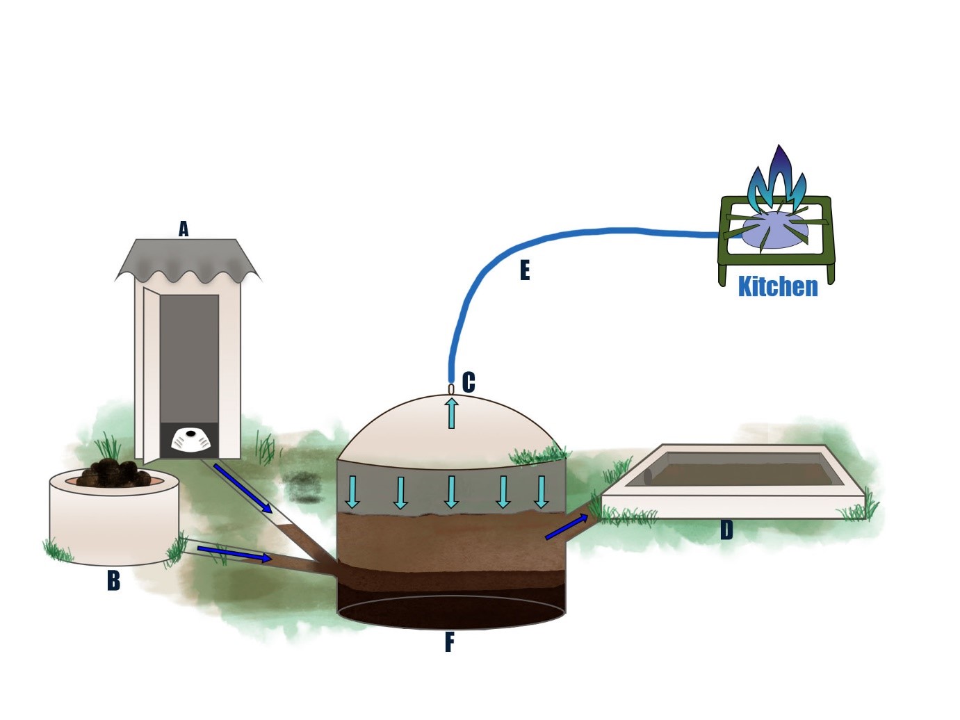 Figure 1 illustrates the functioning of a TLAD: the feedstock from the toilet (A) and the cow/animal dung and other organic waste inlet (B) flow into the digester (F) after mixing with water. Domestic digesters do not produce adequate biogas for a family’s needs using only human excreta, and so it is co-digested with other feedstocks (Boyd Williams et al., 2022). As the organic waste decomposes, biogas builds up inside the digester and flows through a pipe (E) directly to the kitchen stove through a pressure gradient. The production of biogas increases the pressure inside the fixed dome structure (C) and forces the by-product of the process (a nutrient rich and predominantly liquid slurry, which can be used as a plant fertiliser) out and into the slurry storage area (D). Typically, (C) is all that can be seen above ground, though in some cases both (F) and (C) are buried underground.