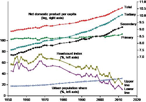 The urban population share has been rising steadily over time in India, from 17% in 1950 to 31% today. However, India’s pace of population urbanisation (proportionate increase in the urban population share) has been less than either South Asia as a whole or lower middle-income countries as a whole, and markedly slower than for, say, China. The trend rate of growth in India’s net domestic product (NDP)1 per capita in the period 1958-1991 was under 2% per annum. The picture that emerges from the accumulating evidence from India’s National Sample Surveys (NSS) (that started in the 1950s) indicates that economic growth in India up to the start of the 1990s, though slow, had in fact been poverty reducing. Ravallion and Datt (1996) showed that the elasticity (degree of responsiveness in proportionate terms) of the incidence of poverty with respect to average household consumption was -1.3 over 1958-1991. (For example, a 10% increase in mean consumption came with a 13% decrease in the poverty rate on average.) Given the modest rate of growth over this period, success at avoiding rising inequality prior to the 1990s was key to this outcome.