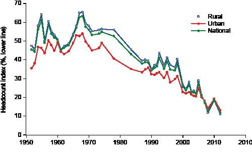 India’s long-run progress against absolute poverty is evident from our findings using data spanning nearly six decades from 1957 to 2012. Figure 1 provides a summary, giving both national accounts aggregates and the poverty rates for two poverty lines (discussed further in Datt et al. 2016). The trend decline in the national incidence of poverty for our upper line was 0.65% points per annum, accumulating to a sizeable fall in the poverty rate of more than 35 percentage points. In proportionate terms, poverty incidence declined at the rate of 1.3% per annum.