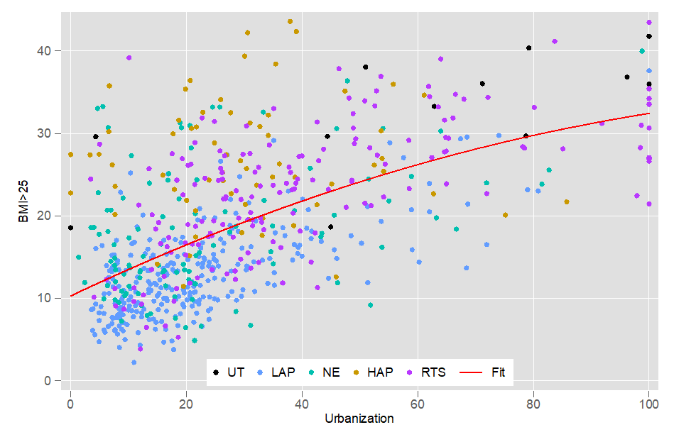 ग्रामीण भारत में मोटापे के रुझान संकेत करते है कि मोटापे के बोझ का एक बड़ा हिस्सा अधिक शहरीकृत राज्यों (एनएफएचएस, 2015-16) में है। आकृति 2 में हम मोटापे की घटनाओं और शहरीकरण की गहनता के बीच जिला स्तरीय सहसंबंध को चित्रित करते हैं। बिंदुओं का रंग राज्यों को उनके संरचनात्मक परिवर्तन के चरण के आधार पर वर्गीकृत करता है (पिंगली एवं अनय 2019)। यह देखा जा सकता है कि अधिक शहरीकरण वाले जिलों में महिलाओं में मोटापा भी अधिक है।
