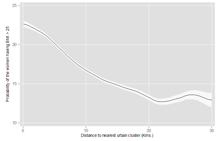 हम एनएफएचएस (2015-16) से व्यक्तिगत स्तर के आंकड़ों का उपयोग करते हैं। पोषण संबंधी संकेतकों के साथ, यह डेटासेट हमें सैम्पल गांवों2 की भूस्थिति और शहरी केंद्रों से उनकी दूरी के बारे में जानकारी प्रदान करता है। हमारे अनुभव-जन्य परिणाम हमारी परिकल्पना के अनुरूप हैं क्योंकि जैसे-जैसे गांवों से शहरों की दूरी3 कम होती जाती है वैसे-वैसे ग्रामीण महिलाओं के बीच मोटापा रैखिक रूप से बढ़ता है (आकृति 3)।4 हम स्पष्ट रूप से देख सकते हैं कि कैसे शहरीकरण, ग्रामीण निवासियों पर उनके पोषण परिणामों को प्रभावित करके अपना असर ड़ालता है।