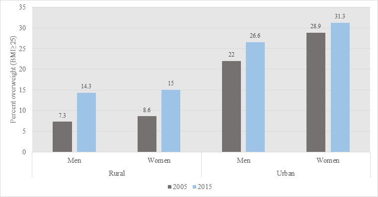 राष्ट्रीय परिवार स्वास्थ्य सर्वेक्षण (एनएफएचएस) 2015-16 के अनुसार भारत के कम से कम 20% लोगों को मोटापे (25 से अधिक बॉडी मास सूचकांक (बीएमआई)1) से ग्रस्त हैं, जिनमें महिलाओं की संख्या अधिक है। आम तौर पर शहरों में मोटापे से ग्रस्त होने की संभावना अधिक है, लेकिन हाल के दशक में मोटापे में वृद्धि का कारण ग्रामीण क्षेत्र है जहां परंपरागत रूप से लगातार अल्प-पोषण एक विशेषता रही है (आकृति 1)। हालिया शोध में हमने पाया है कि ग्रामीण महिलाओं के मोटापे में इस वृद्धि का कारण भारत के आर्थिक परिवर्तन अर्थात शहरी आर्थिक वृद्धि और इसकी ग्रामीण विकास पर पड़ने वाले इसके प्रभाव है (अय्यर, रहमान और पिंगली 2021)।