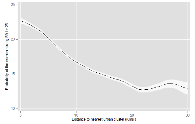 According to the National Family Health Survey (NFHS), 2015-16, nearly 20% of India’s population is obese. This article shows that the country’s obesity trends have followed the nature of its economic transformation whereby urban growth impacts rural development. It finds that an additional kilometre of urban influence on surrounding villages leads to an increase in obesity incidence among approximately 3,000 rural women.