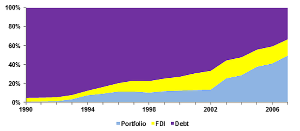 India’s approach to liberalisation of capital controls has been measured. Instead of a ‘big-bang’ opening up of the capital account, India has adopted a gradual approach towards capital account liberalisation, prioritising the liberalisation of non-debt creating flows such as foreign direct investment (FDI) and portfolio flows. These flows involve risk sharing between foreign investors and the host country and thus tend to be more stable than debt flows. While FDI and portfolio flows have been steadily liberalised, debt flows are subject to numerous restrictions. This has resulted in the share of debt liabilities in external liabilities dropping from 95% in 1990 to 33.2% in 2007 (Figure 1). Over the same period the share of portfolio liabilities increased from less than 1% to nearly 50%, while that of FDI went up from 4% to 17.2%.