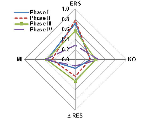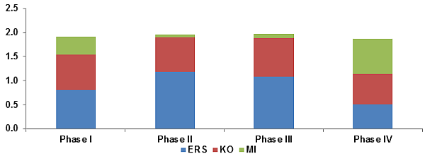 We adjust each variable to between 0 and 1 with 0 indicating closed capital account, completely flexible exchange rate, zero monetary independence and zero reserve accumulation. We divide the entire period into four equal sub-periods (1996-97Q1 to 1999-00Q4, 2000-01Q1 to 2003-04Q4, 2004-05Q1 to 2007-08Q4 and 2008-09Q1 to 2011-12Q3), and plot the average value of the indices in Figure 2.