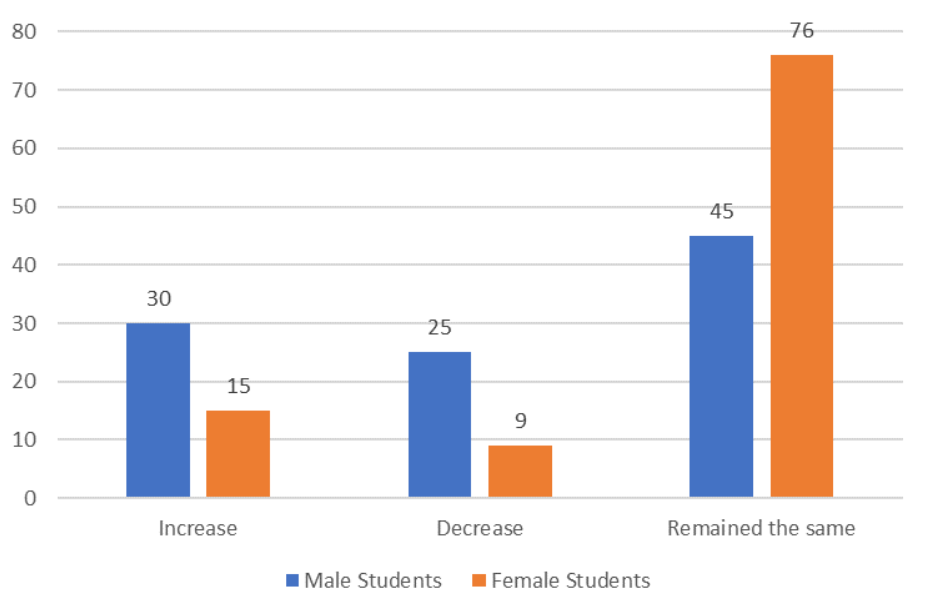 We found that about 41% of boys do not contribute to household work at all, and about 48% spend only 1-2 hours in such work. On the other hand, over 54% of girls spend at least 1-2 hours and 36% spend 3-4 hours on unpaid domestic work. Over 5% of girls spend more than five hours on such work. However, since the pandemic, male participants’ time spent on unpaid work such as cooking, cleaning, and childcare had increased at higher rates comparable to their female counterparts (see figure 2).