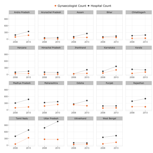 Figure 1. Gynaecologist and hospital count across Indian states, 2008 & 2013