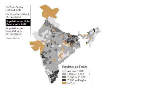 Note: These figures exclude Gujarat and Jammu & Kashmir, for which DLHS-4 data have not been released. Figure 2 shows spatial variations in the percentage of vacancies and population served per facility with the required personnel on staff. The map provides district-level information on the percentage of facilities without an ANM or gynaecologist, as well as the population served by each of these workers. ANMs are India’s bulwark against maternal and infant mortality: For any lower-level health facility, such as the sub-centre, an ANM is the first point of contact for pregnant women seeking healthcare. Yet many sub-centres remain without an ANM, and the majority of hospitals still do not have a single gynaecologist.