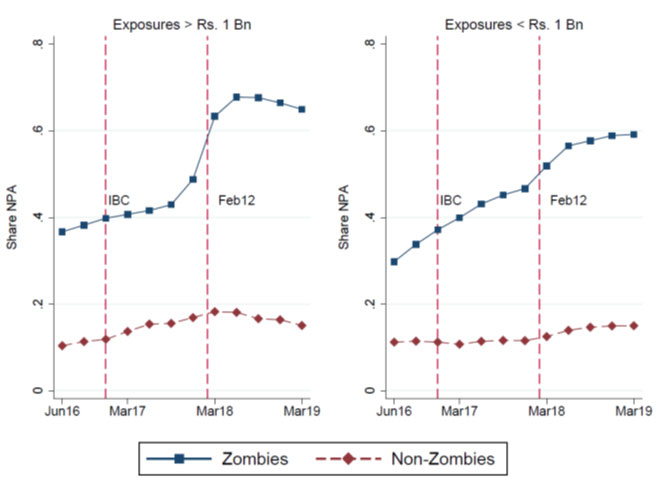 The zombie problem is neither new nor specific to India. It drew attention after Japan’s ‘lost decade’, as economists wondered what factors held back Japan’s growth. Still, although the zombie problem has been documented in Japan and around the world, we know little about how to solve it. India underwent two policy interventions, spaced two years apart, which provide us with a valuable window into potential solutions. The first was a major overhaul of its bankruptcy system, known as the Insolvency and Bankruptcy Code (IBC) of 2016. The second was a regulatory intervention in 2018, put in place by the RBI, which forced banks to recognise and initiate the curing of defaults as soon as they took place. This regulatory intervention is popularly known as the ‘February 12th circular’. Our analysis ends in the first quarter of 2019, just before the Supreme Court quashed the February 12th circular on the grounds that the RBI had exceeded its authority.