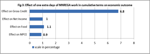 Figure 3 shows the effect of one extra day of MNREGA work in cumulative terms on economic outcome in terms of percentage increase. MNREGA participation has a significant positive effect on MPCE, monthly food expenditure and monthly per capita income net of MNREGA earnings. On average, all three outcomes increased by around 1% with one extra day of MNREGA work in cumulative terms. Most surprising, the maximum impact is in the case of the gross volume of monthly credit, which increased by 6.8%.
