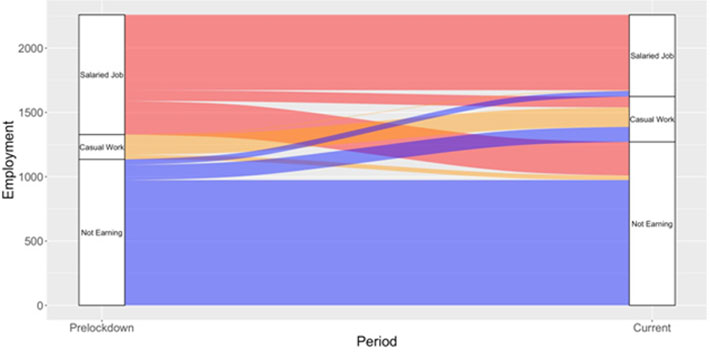 जिन उत्‍तरदाताओं को लॉकडाउन से पहले की अवधि में वेतनभोगी नौकरी मिली थी उनमें से लगभग एक तिहाई उत्तरदाताओं (32%) की नौकरी जा चुकी थी। साथ ही, अनियत कार्य करने वाले उत्तरदाताओं का अनुपात 9% से बढ़कर 16% हो गया। अपनी नौकरी खो चुके उत्तरदाताओं (संख्या में 296) में से लगभग आधे (47%) ने कहा कि उन्होंने अपनी नौकरी स्वेच्छा से छोड़ दी थी, 23% ने कहा कि उनकी नौकरी इसलिए चली गई क्योंकि लॉकडाउन के कारण उनके कार्यालय बंद हो गए थे और 9% लोग ऐसे थे जो लॉकडाउन से पहले होली की छुट्टी के दौरान अपने घर आए थे लेकिन अंतरराज्यीय यात्रा पर रोक लगने के कारण काम पर वापस नहीं जा सके। वेतनभोगी रोजगार (संख्या में 634) में बने रहने वालों में से 37% अवकाश पर थे (इनमें से 12% को नियोक्ताओं द्वारा नहीं आने के लिए कहा गया था, 62% लोगों के कार्यालय लॉकडाउन के कारण बंद थे और बाकी ने स्वेच्छा से छुट्टी पर जाने का फैसला किया था) और उनमें से अधिकांश को वेतन का भुगतान नहीं किया गया था। यह एक उच्च स्तर की अनिश्चितता को इंगित करता है, यहां तक ​​कि उन लोगों के बीच भी जो अभी भी औपचारिक रोजगार में हैं।