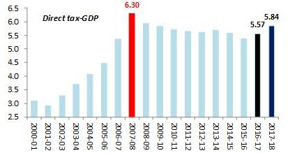 But the moot question is did higher tax compliance increase tax revenues sharply? The Figure 1 below clearly illustrates the 5.84% direct tax-GDP ratio in 2017-18 was way below the 6.3% peak achieved in 2007-08. Nor is it significantly higher than the preceding 10-year average of 5.72%. Merely adding lakhs of new tax returnees does not serve any purpose if they do not contribute significantly to tax collections.