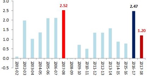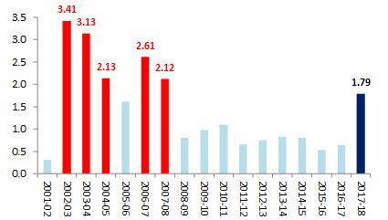 Source: FY18 – Controller General of Accounts (CGA); FY16-FY17 – Union Budget 2018-19; up to FY15 – Income Tax Department. Figure 2. Personal income tax buoyancy: No extra bounce