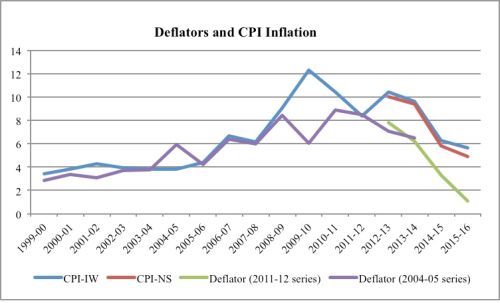 As an approximation, it is worthwhile checking what would happen if the manufacturing GVA as calculated by the CSO used the CPI in place of the WPI as a deflator. The official numbers show that in 2015-16, nominal growth was 8%, and real growth 9% in this sector. If the correct deflator was actually around 3%, in line with CPI manufacturing inflation, then real growth was only around 5% - much more in line with the IIP.