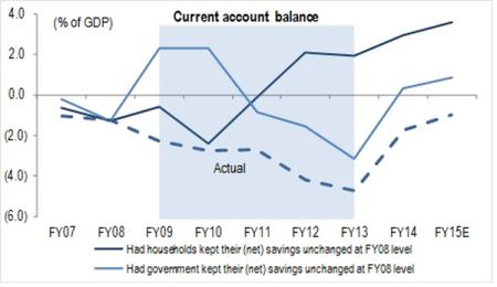 Finally, borrowings of households are directly linked with their physical savings, as the former finance the latter. Household investments (or physical savings, primarily in the form of real estate), in general, are less efficient than corporate investments. A higher proportion of household investment in total investment implies lower efficiency of total investments, which acts as a drag on economic growth (Figure 2). Household investments rose from 28% of total productive investments (all investments excluding valuables) in FY2008 to 45% in FY2013, while corporate investments fell from about 48% to 31%. These movements had a bearing on the efficiency of investments, which impacted real Gross Domestic Product (GDP) growth.