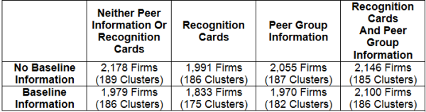 - Baseline information: Firms assigned to this intervention group received additional information on the aggregate registration, filing, and payment rates for their cluster in the previous period.