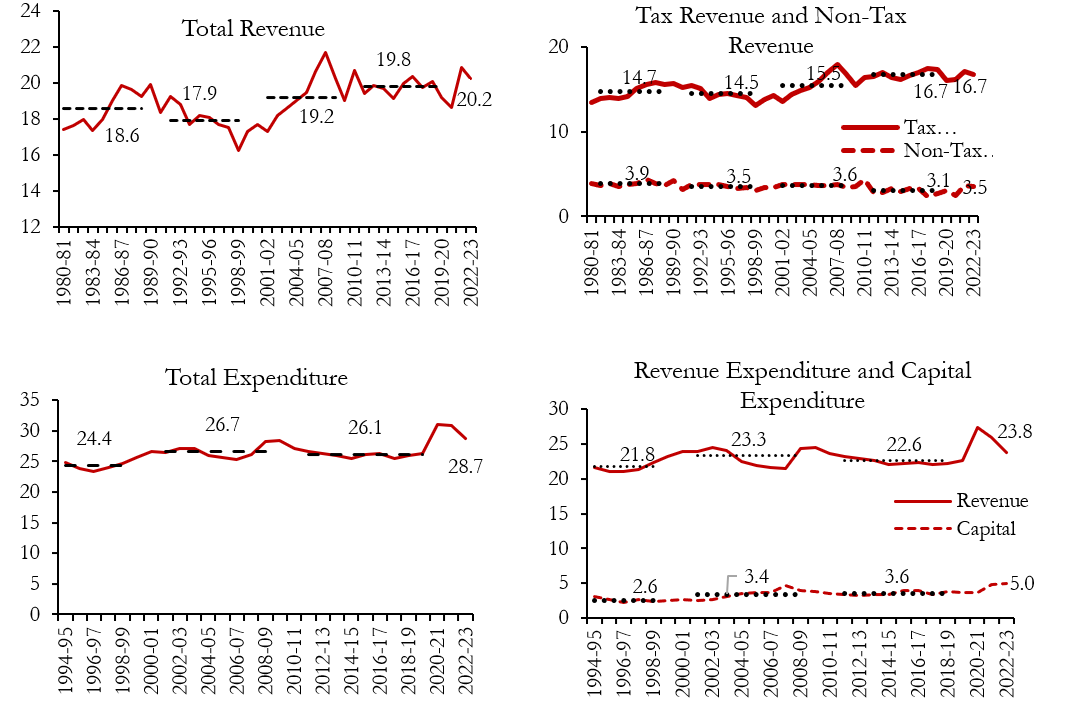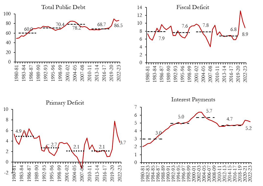 Notes: i) Total public debt in India includes debt issued and other liabilities in the Public Account consisting of National Small Saving Fund (NSSF), Provident Fund, Deposit and Reserve funds, securities issued to finance subsidies on oil, food and fertilisers, etc. ii) Dashed horizontal lines are decadal averages from 1980-81 to 1989-90, 1990-91 to 1999-2000, 2000-01 to 2009-10, and 2010-11 to 2019-20, respectively.