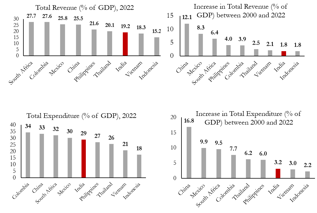 Notes: i) The figures in the top row show median and interquartile range of 83 emerging market and middle-income economies (83 countries) and India. ii) The figures in the middle and bottom row compare India’s fiscal indicators with those of select emerging markets. iii) Data for India is for fiscal years.