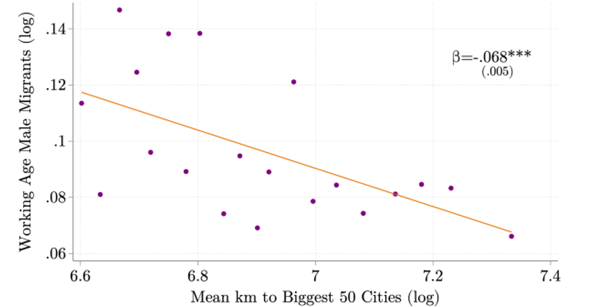 Notes/Sources: (i) The vertical axis (y axis) depicts the log number of working-age male migrants in a household (plus one, to account for log-zero errors). (ii) The horizontal axis (x axis) depicts the log of mean (average) distance from each district to the 50 biggest districts by population (iii) Orange line is the best linear fit, constructed from an ordinary least squares (OLS) regression of the y-axis variable on the x-axis variable.