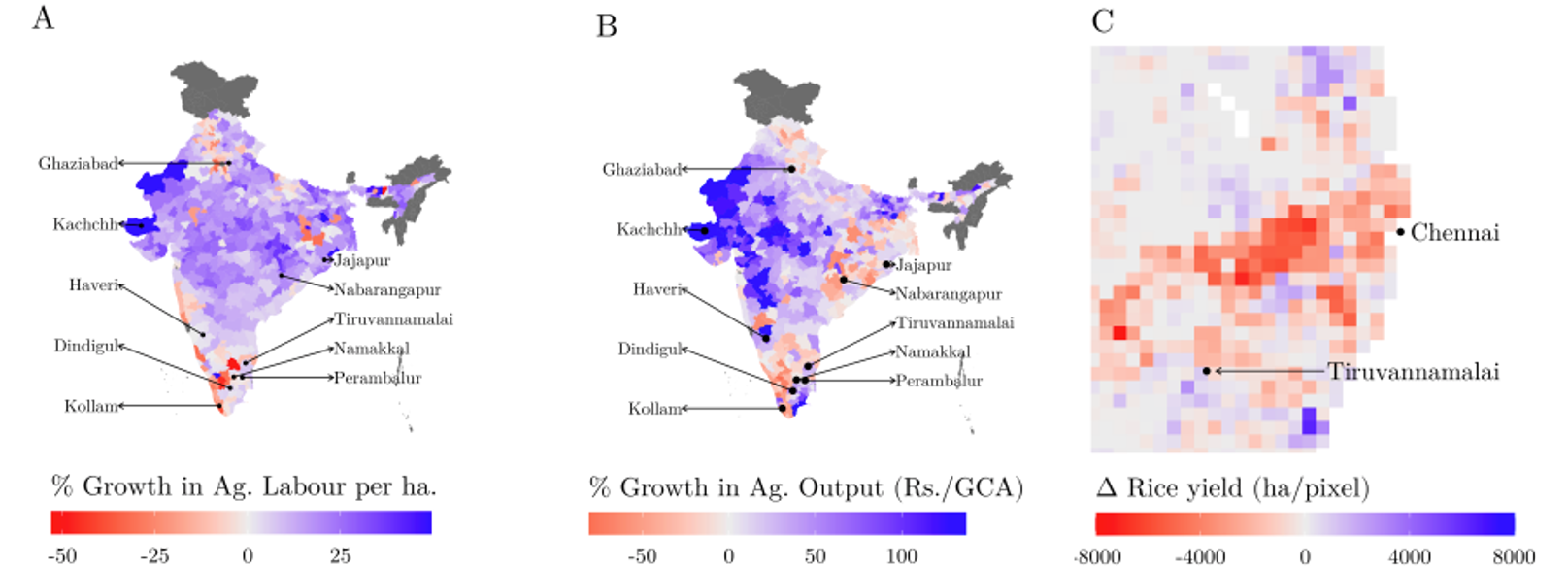 Notes/Sources: (i) The top 10 highest-growth cities are labelled. (ii) Panel A maps percentage change in agricultural workers per hectare of cultivated area, using data from the 2001 and 2011 Census. (iii) Panel B maps the percentage change in crop output, using data from the ICRISAT database. (iv) Output is measured as value of all crops produced in a district divided by gross cropped area. (v) Values (in both panels) are truncated at the 5th and 95th percentile. (vi) Panel C maps the change in harvested rice area per pixel from the GGCP10 satellite product.