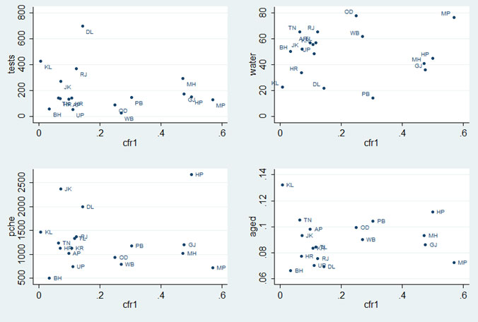 As is widely acknowledged, swift and accurate testing is critical to fight Covid-19. We use tests conducted per million population as on 12 April. CFR exhibits a negative association with tests per million population (Figure 2, top left panel). For instance, Kerala has been conducting more than 425 tests per million population and has the lowest CFR among all states.