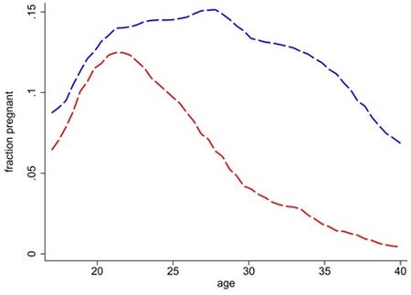 In India, one important characteristic on which pregnant women differ from other women is age. The red curves in Figures 1a and 1b below show that pregnancy in India is concentrated between the ages of 18 and 25. These are also the ages at which women are most likely to be underweight. In order to present a more accurate estimate of pre-pregnancy body mass and fraction underweight in India, I adjust for selection into pregnancy based on age, and a number of other characteristics that are associated with both pregnancy and body mass. Using the latest nationally representative data on women´s weights and heights from the NFHS-3, I find that the average BMI of pre-pregnant women in India is 19.5, and that the fraction of pre-pregnant women who are underweight is 42.2%. This is almost 7 percentage points higher than the fraction underweight among women of child-bearing age!