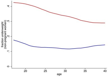 Notes: (i) Red curves plot Indian data; blue curves plot African data. (ii) The curve for India uses data from 2005, the curve for sub-Saharan Africa uses data from 2000–2010. Figure 1b. Proportion of non-pregnant women who are underweight, in India and sub-Saharan Africa