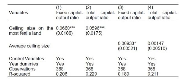 Table 1. Relationship between land ceilings and investment in fixed and total capital-output ratios