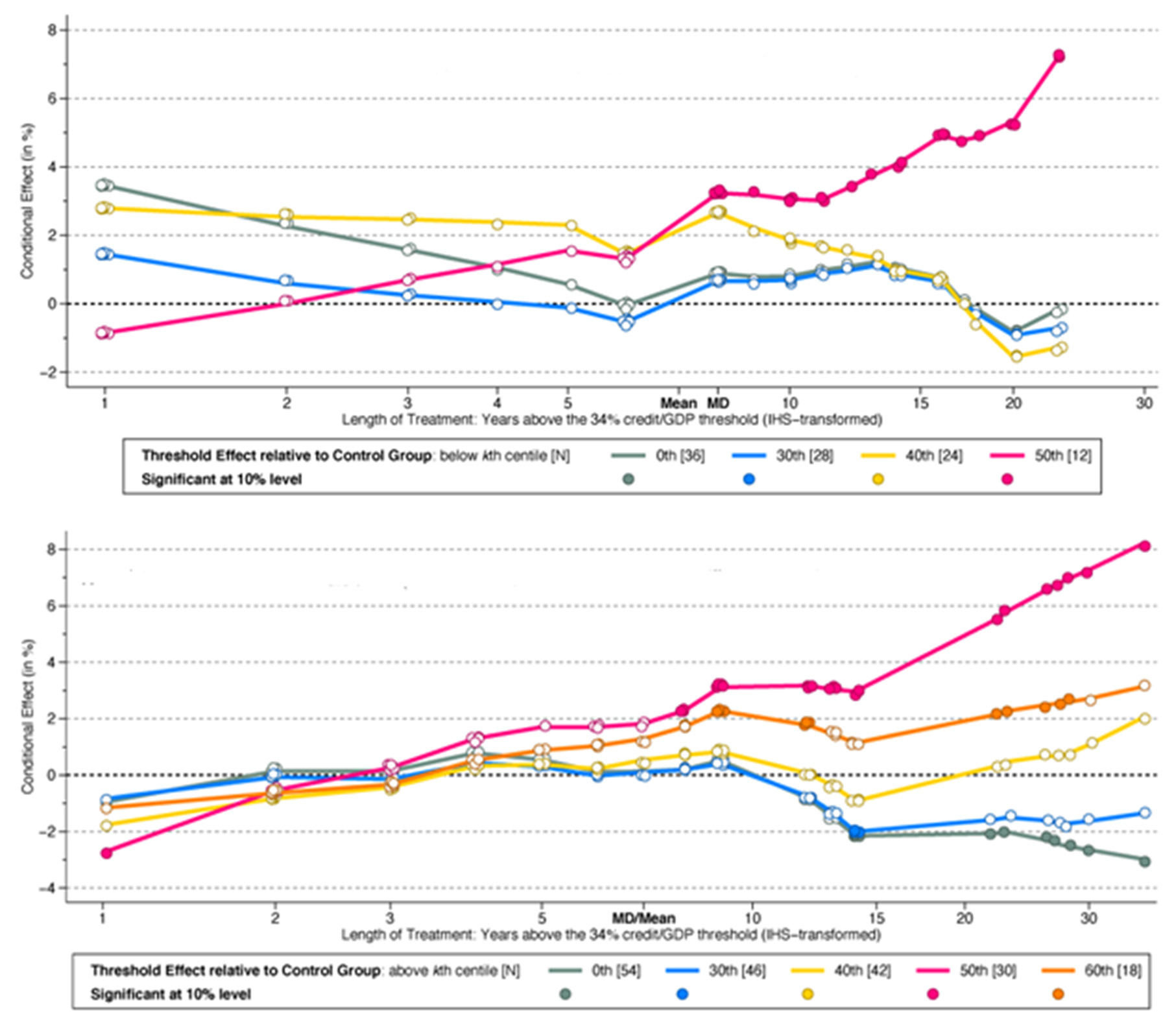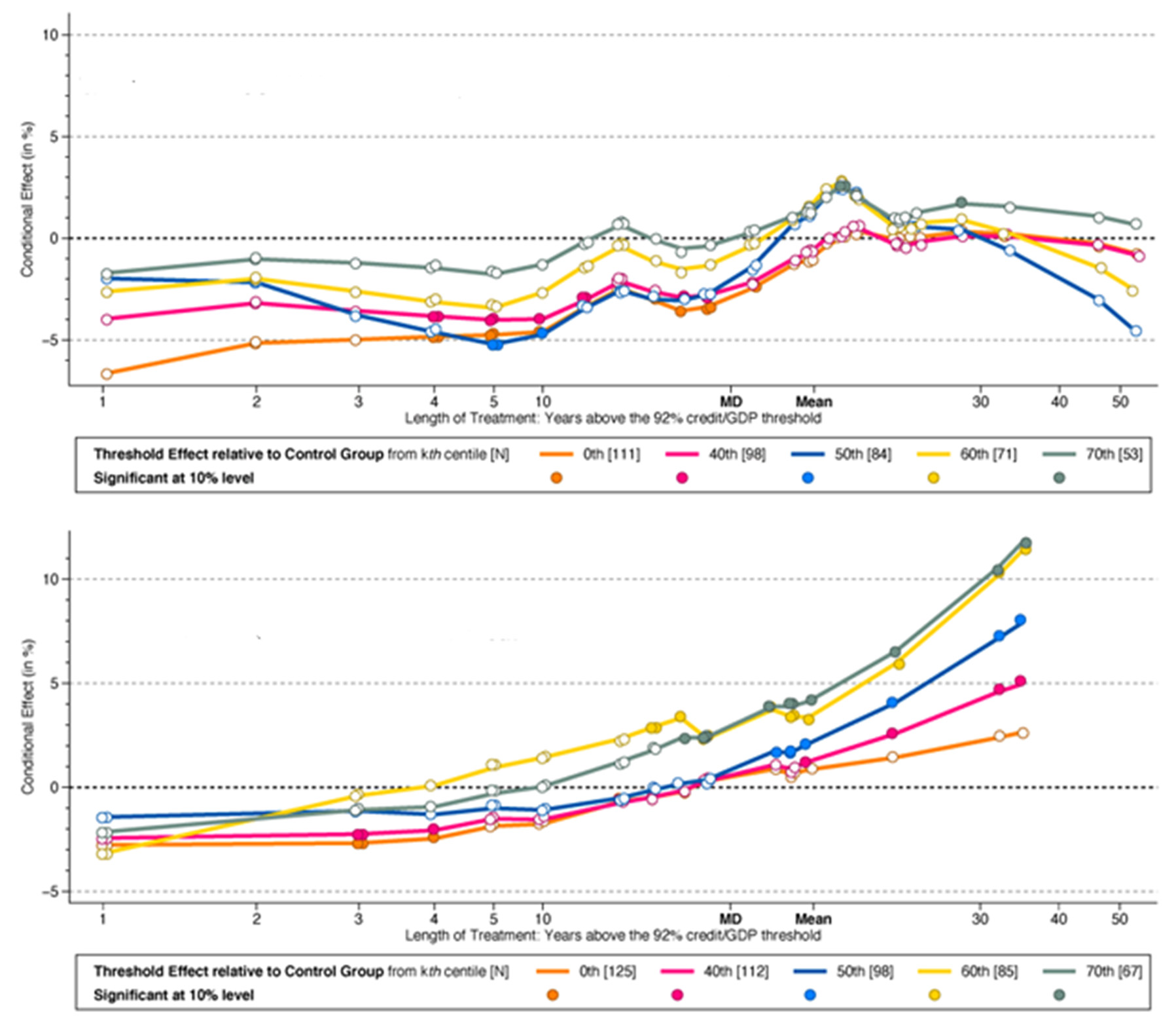Figure 1. The long-run growth effects of 'too much finance', threshold effect of 92% credit/GDP (top panel) and 119% credit/GDP (bottom panel)