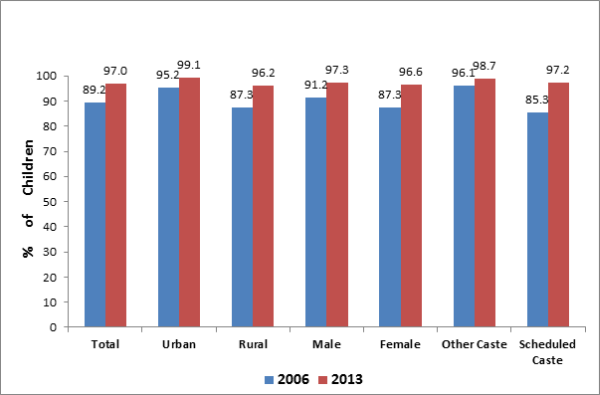 Young Lives, a longitudinal2 research study on childhood poverty, has been following 3,000 children comprising two cohorts - eight year olds (1,000 children) and one year olds (2,000 children) – in undivided Andhra Pradesh (now, Telengana and Andhra Pradesh) since 2002. In 2013, the fourth round of survey was completed. The first cohort of children completed 12 years of age in 2006 and the second cohort of children were aged 12 years in 2013; the data allows comparison of 12-year-olds in 2006 with 12-year-olds in 2013. The 2013 survey has shown an encouraging trend of 97% of elementary school enrolment among 12-year-olds, up from 89% in 2006 (Figure 1). Given that Young Lives has a pro-poor sample3, it is heartening to note that no major gaps in enrolment have been found across gender, caste, or urban/ rural location.