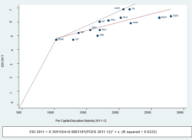 Figure 2b. Education service delivery (Education Development Index (EDI)) and per-capita education subsidy, 2011-12