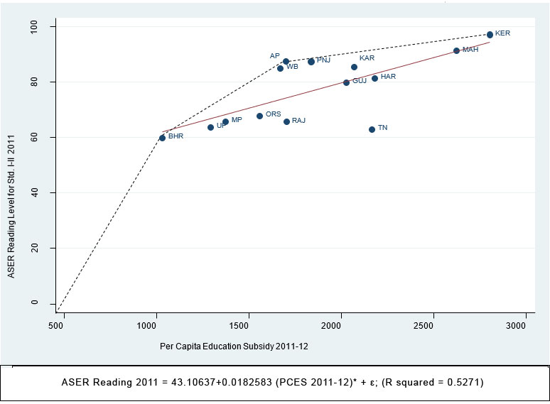 Figure 3a. Education service delivery (ASER reading level for grade 1-2 in 2011) and per-capita education subsidy, 2011-12