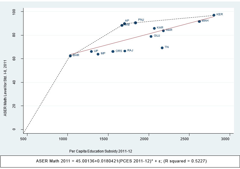 Figure 3b. Education service delivery (ASER math level for grades 1-2 in 2011) and per-capita education subsidy, 2011-12