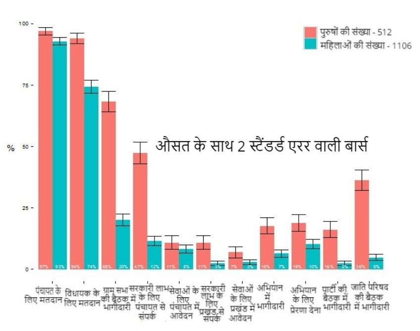 इसके बावजूद नागरिकों के बतौर महिलाएं पूरी दुनिया में और खास कर निम्न तथा मध्यम आय वाले देशों में राजनीतिक क्षेत्र में कम दिखती और बोलती हैं। आकृति 1 में इस गंभीर लैंगिक अंतर (जेंडर गैप) को दर्शाया गया है। वर्ष 2016 में मैंने ग्रामीण मध्य प्रदेश में 5,371 महिलाओं और 2,399 पुरुषों का एक सर्वे किया और पाया कि महिलाओं की अपेक्षा पुरुषों द्वारा यह कहने की 50 प्रतिशत अंक अधिक संभावना थी कि उन्होंने ग्राम सभा की बैठक में भाग लिया है और 30 प्रतिशत अंक अधिक संभावना थी कि उन्होंने स्थानीय नेता से संपर्क किया है। इसके अलावा, राजनीतिक व्यवहार में इस लैंगिक अंतर की मात्रा राजनीतिक व्यवहार में जाति आधारित अंतर की अपेक्षा काफी अधिक रही है जो अधिकांश शोध का फोकस रहा है। पूरे भारत के सर्वे के प्रतिनिधिक आंकड़े दर्शाते हैं कि पांच जातिगत उप-श्रेणियों के मामले में ग्राम सभा की बैठकों में पुरुषों की औसतन 25 से 33 प्रतिशत और महिलाओं की औसतन 6 से 11 प्रतिशत उपस्थिति रही है (देसाई एवं अन्य 2011)। इससे पता चलता है कि भागीदारी के मामले में जातियों के बीच अंतर पुरुषों और महिलाओं के बीच अंतर से काफी कम स्पष्ट है।