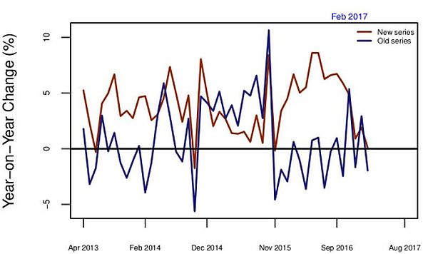 Figure 1. Annual % change in IIP (manufacturing) from 2004-05 and 2011-12 series, April 2013 to February 2017