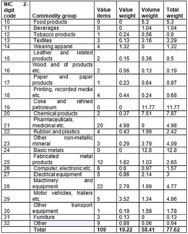 - Group item is both volume and value based: For instance NIC code 29 – ‘Manufacture of motor vehicles, trailers and semi-trailers’ – has a total weight of 4.8573%, of which, 3.5192% is value based and 1.3381% is volume based.