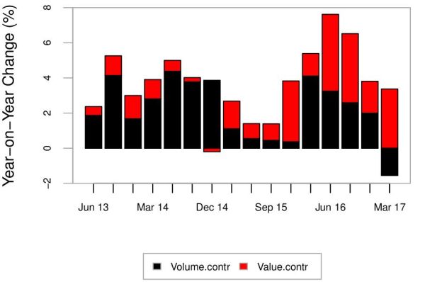 Figure 2. Contribution of value- and volume-based items to growth of IIP (manufacturing), April-June 2013 to January-March 2017