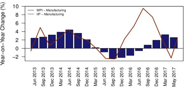 Figure 3. Trajectory of growth in IIP (manufacturing) (new series) and WPI inflation, April-June 2013 to January-March 2017