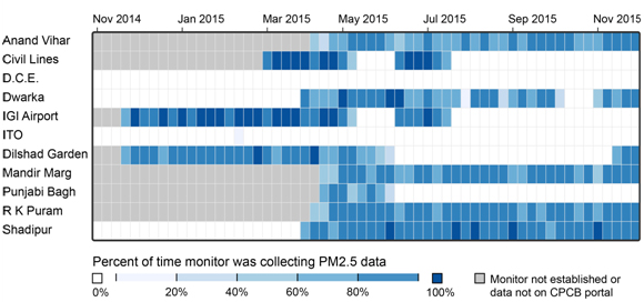 Data obtained from the website of the Central Pollution Control Board (CPCB) for the 11 monitors run by the Central Pollution Control Board and Delhi Pollution Control Committee (DPCC) show that PM2.5 was being recorded only 29% of the time at these sites last winter – the season associated with the most severe levels of particulate pollution. Coverage since March 2015 has increased to 46%, but these gaps in the data make it difficult to reliably characterise the actual air quality situation in the city. Continuing the trend of improvement in coverage should be a high priority.